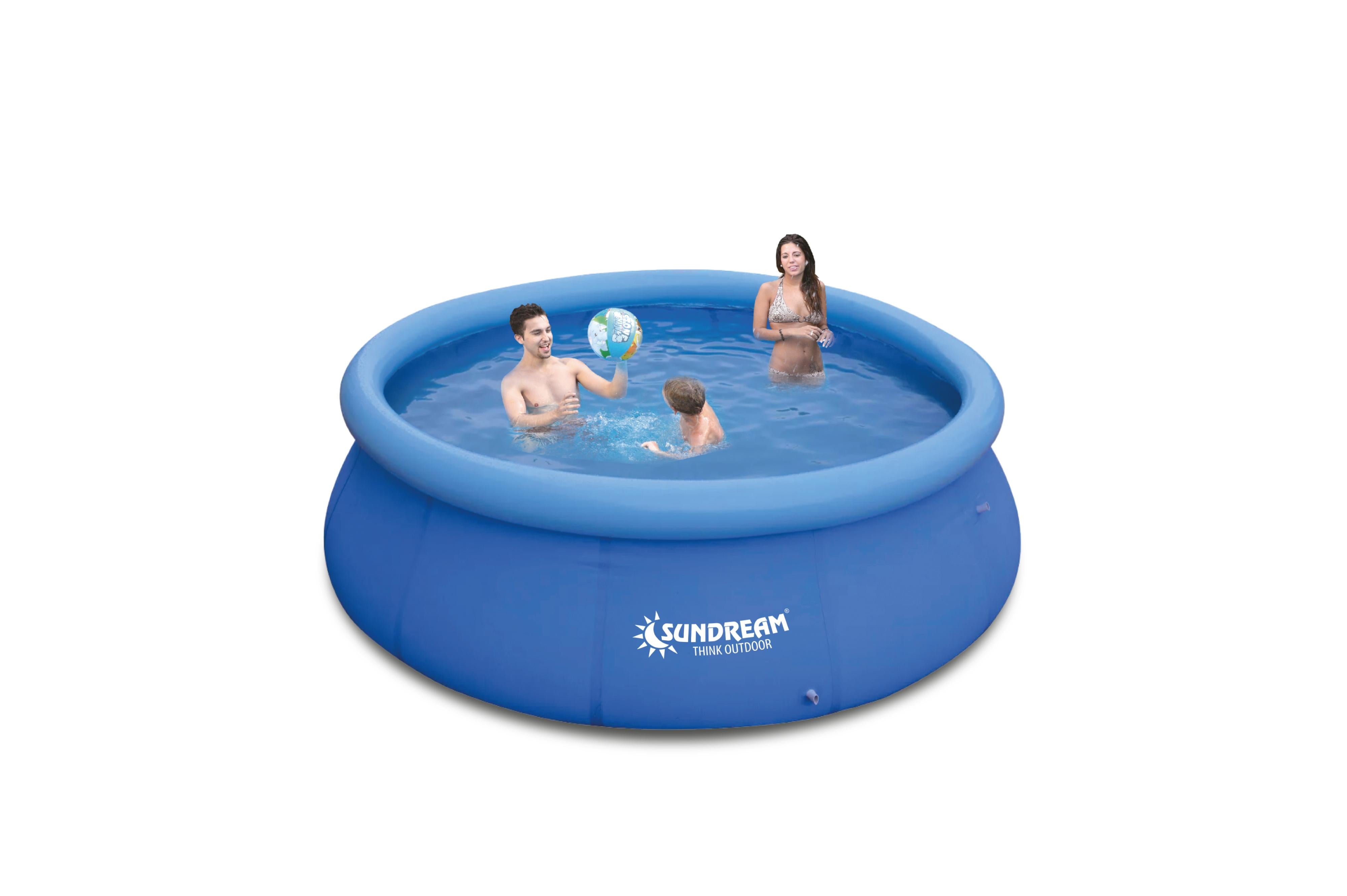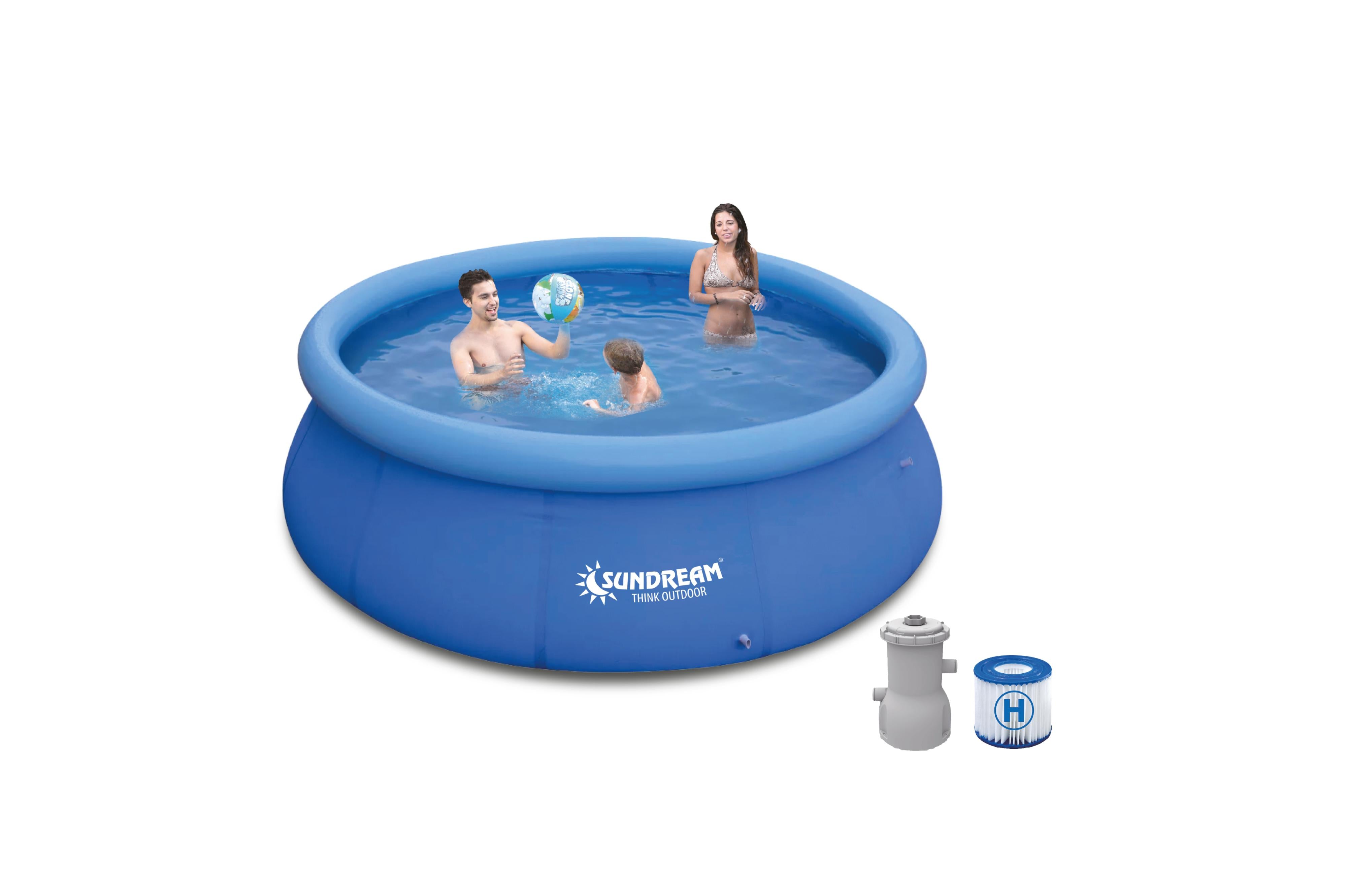 Holen Sie sich das ultimative Badevergnügen direkt in den eigenen Garten! Der Sundream Ring Pool aus verstärktem PVC-Spezialmaterial und 3-lagigem DeepTex® Polyester bietet Platz für vier Personen, um sich an heissen Sommertagen abzukühlen. Der Pool hat ein Fassungsvermögen von 3600 Litern und dank des aufblasbaren Seitenrings werden die Seitenwände zusätzlich stabilisiert. Der Pool wird mit einer 300GL Pumpe und einem Repair Kit geliefert und richtet sich bei der Befüllung mit Wasser automatisch auf.