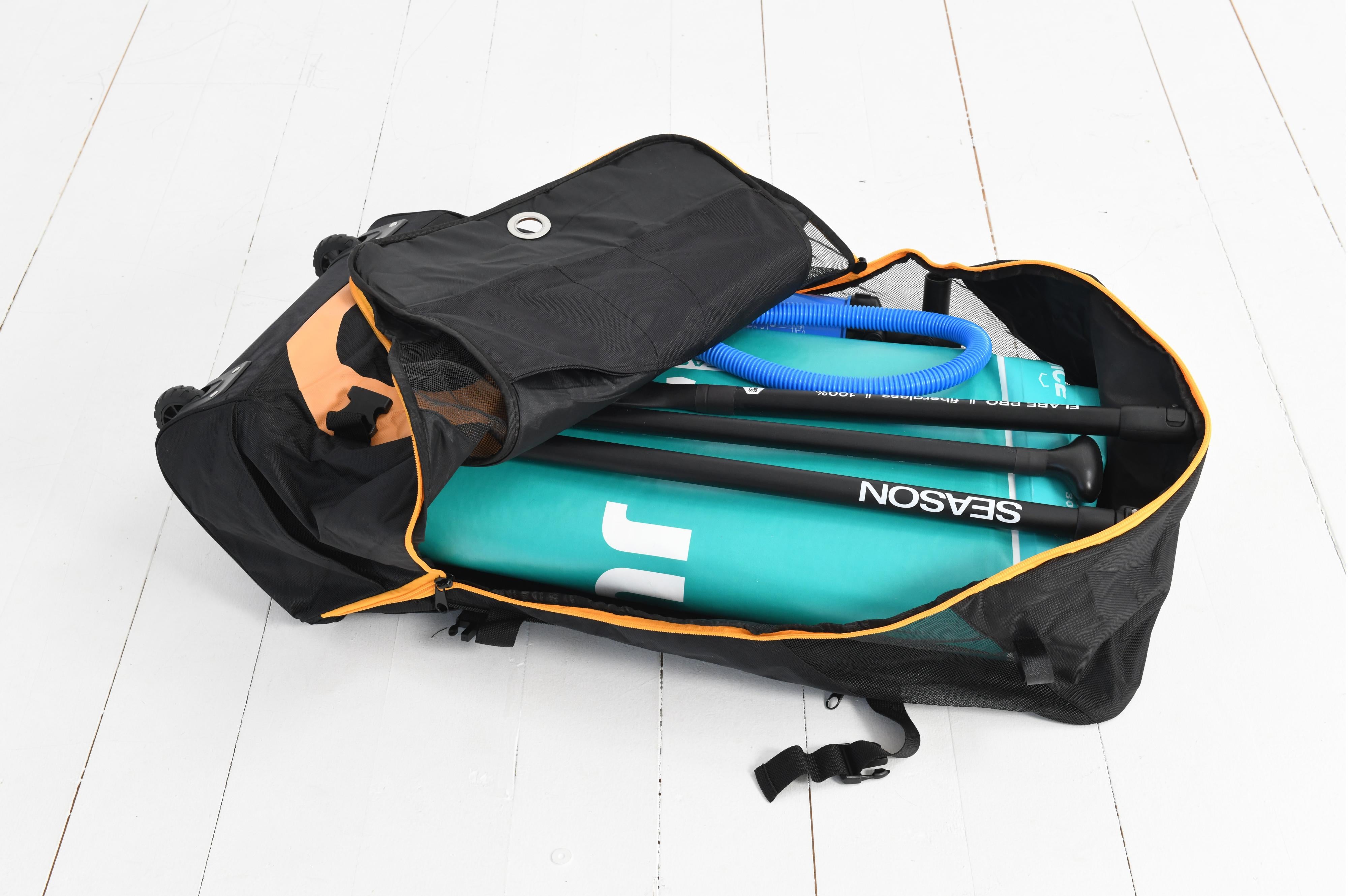 Der neue grosse Wheelie Backpack von Season ist mit Rollen ausgestattet und hat zusätzlich sehr gut gepolsterte Trageriemen, wenn man den Bag auf dem Rücken tragen möchte. Die 117 Liter Inhaltsvolumen werden durch die 18 Liter Aussentasche ergänzt um nasse Artikel oder anderes Zubehör gut verstauen zu können. Die Kompressionsriemen an den Seiten ermöglichen es, das Pack kleiner zu machen und/oder aussen noch anderes Zubehör festmachen zu können. Der Wheelie Backpack ist auch Bestandteil der Venture SUP Linie.